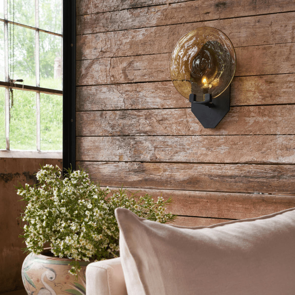 The Emma Sconce features a round glass cover with a geometric iron fixture. This sconce adds a warm glow and a striking silhouette to any modern space. Available in various glass colors.
