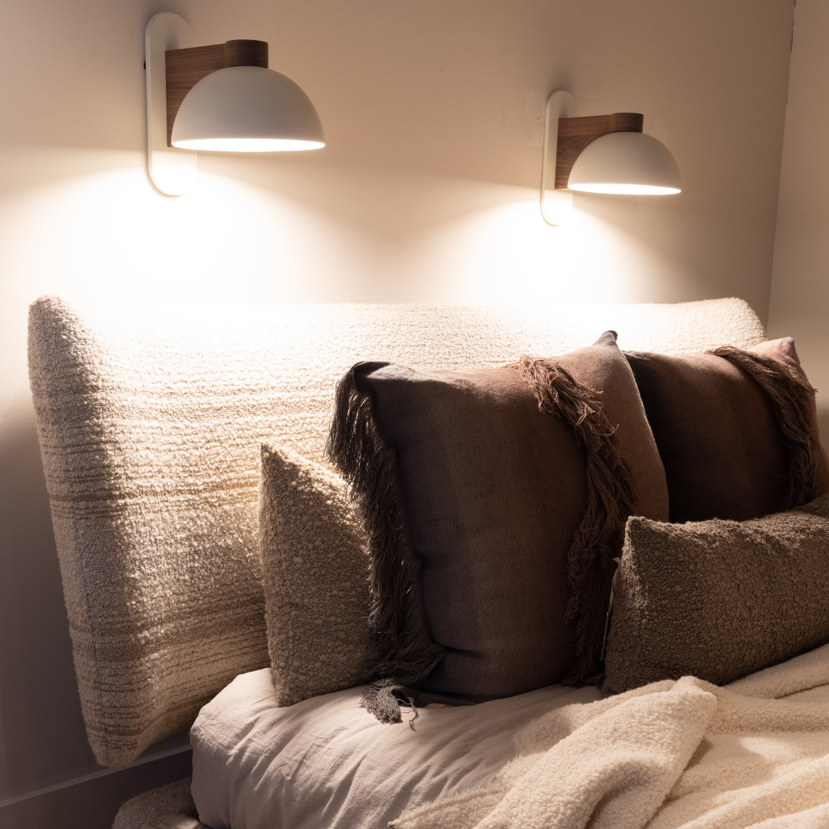 The Fun Guy Sconce has an LED light source and features a balance of crushed stone composite and elegantly shaped hardwood.