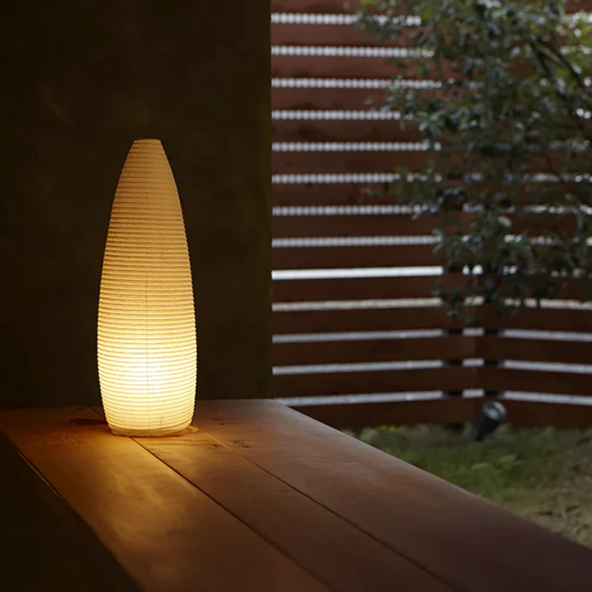 Paper lamp shade omitting a warm, ambient light. Crafted using a traditional washi paper production technique with bamboo ribbing opened over a steel armature.